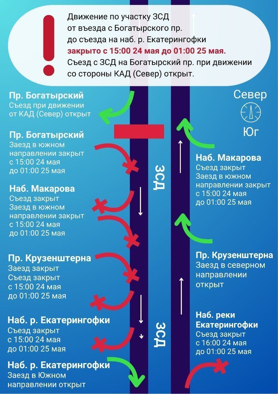 С 16:00 24 мая и ориентировочно до 1:00 25 мая будет закрыто движение на всем участке от Богатырского проспекта до набережной реки Екатерингофки в южном направлении (в северном направлении движение осуществляется в обычном режиме), с 15:00 – заезд на ЗСД с Богатырского проспекта и Васильевского острова в южном направлении, с 16:00 – съезд с ЗСД на набережную руки Екатерингофки при движении с юга на север.