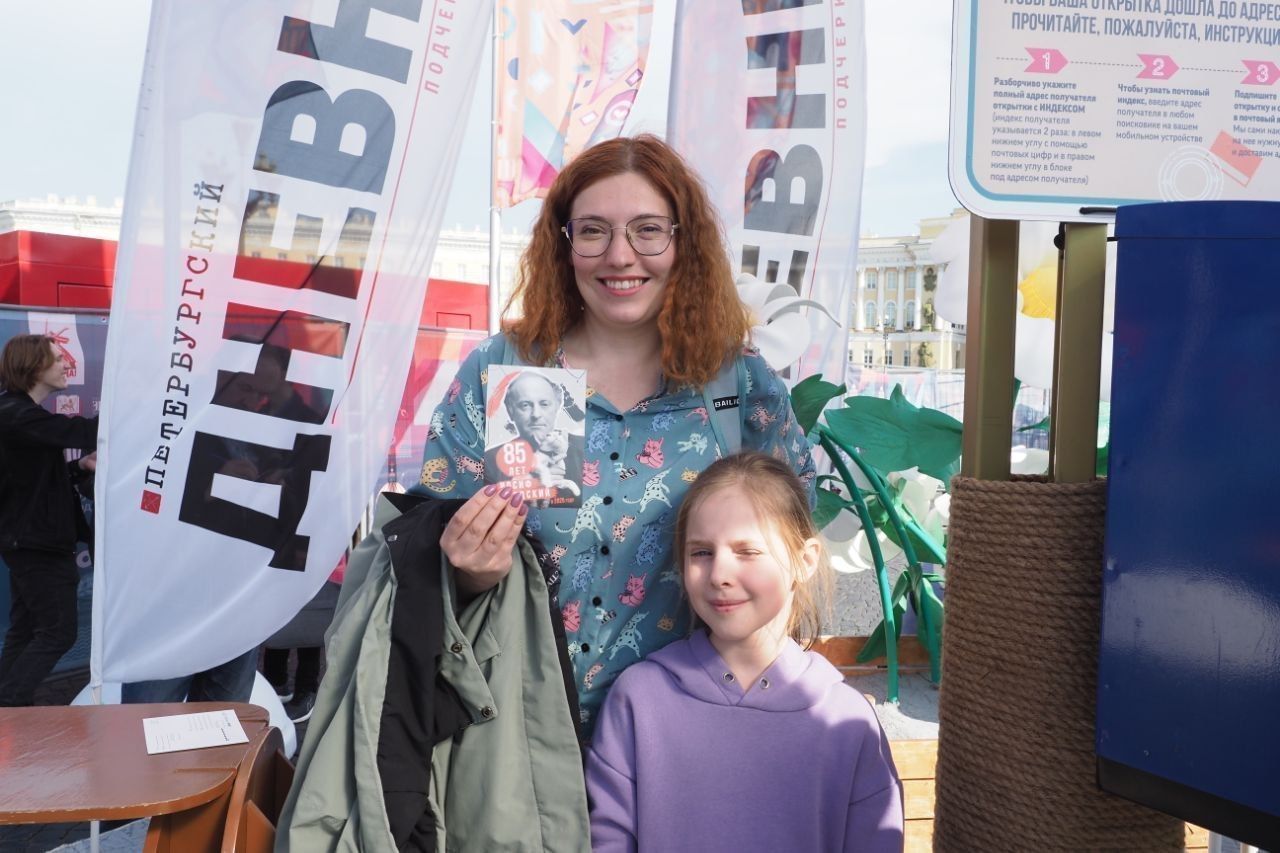 Детский писатель Екатерина Шелеметьева отправила открытку своей бабушке, которая живет в Сибири, со словами: «Привет из солнечного Петербурга». Также на Книжном салоне она презентовала собственную рукопись.