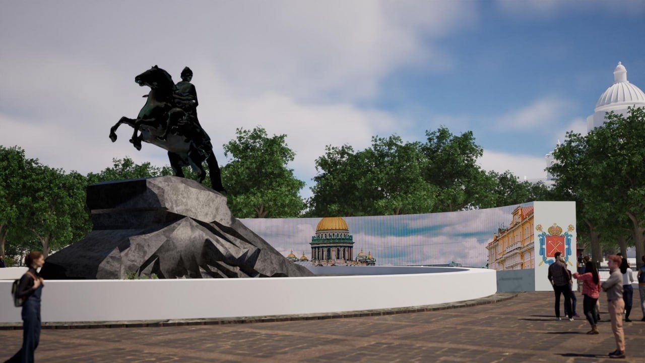 Специалисты устанавливают у памятника Петру I видеоэкраны, звуковое оборудование и сценические конструкции. ГАТИ выдала ордер для обеспечения работ.