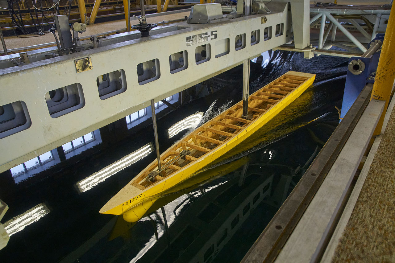 Испытания модели будущего судна в бассейне – последняя возможность для проектантов внести изменения в его конструкцию, доработать форму корпуса, чтобы уменьшить сопротивление и при той же мощности энергетической установки получить максимально возможную скорость хода. При этом у стороннего человека возникает вопрос: не проще ли сделать все то же самое в компьютере? Оказывается – нет.