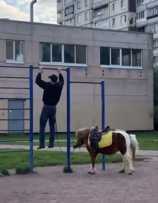 На опубликованных кадах видно, что мужчина подтягивается на турнике, установленном во дворе. А рядом хозяина, что поддерживает дворовый спорт, ожидал пони. Судя по экипировке животного, владелец на нем прискакал. А чтобы пони не убежал, пока мужчина тренируется, он его привзял к своему поясу.