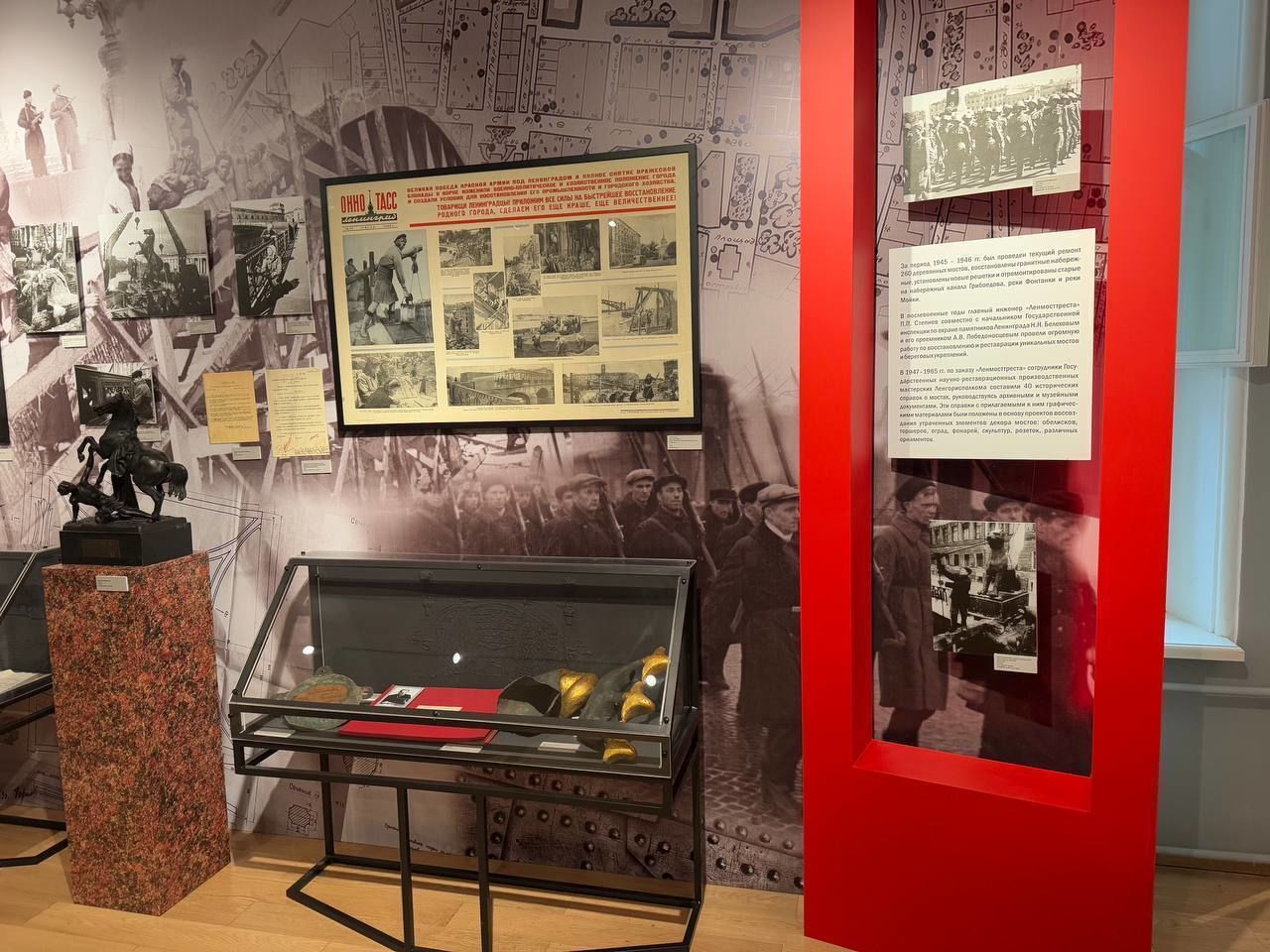 Экспозиция разделена на четыре части: довоенная работа «Ленмосттреста», героический труд инженеров-мостовиков в кольце блокады, а также послевоенное восстановление и графика из фондов музея.