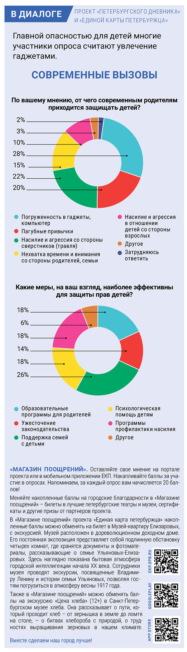 В вопросе «от чего современным родителям приходится защищать детей?» 28 процентов опрошенных выбрали погружённость в гаджеты и компьютер, 22 процента – насилие и агрессию со стороны сверстников, 20 – пагубные привычки, 15 – нехватку времени и внимания со стороны родителей и семьи, десять – насилие и агрессию в отношении детей со стороны взрослых, три – другое, два процента – затруднились ответить.