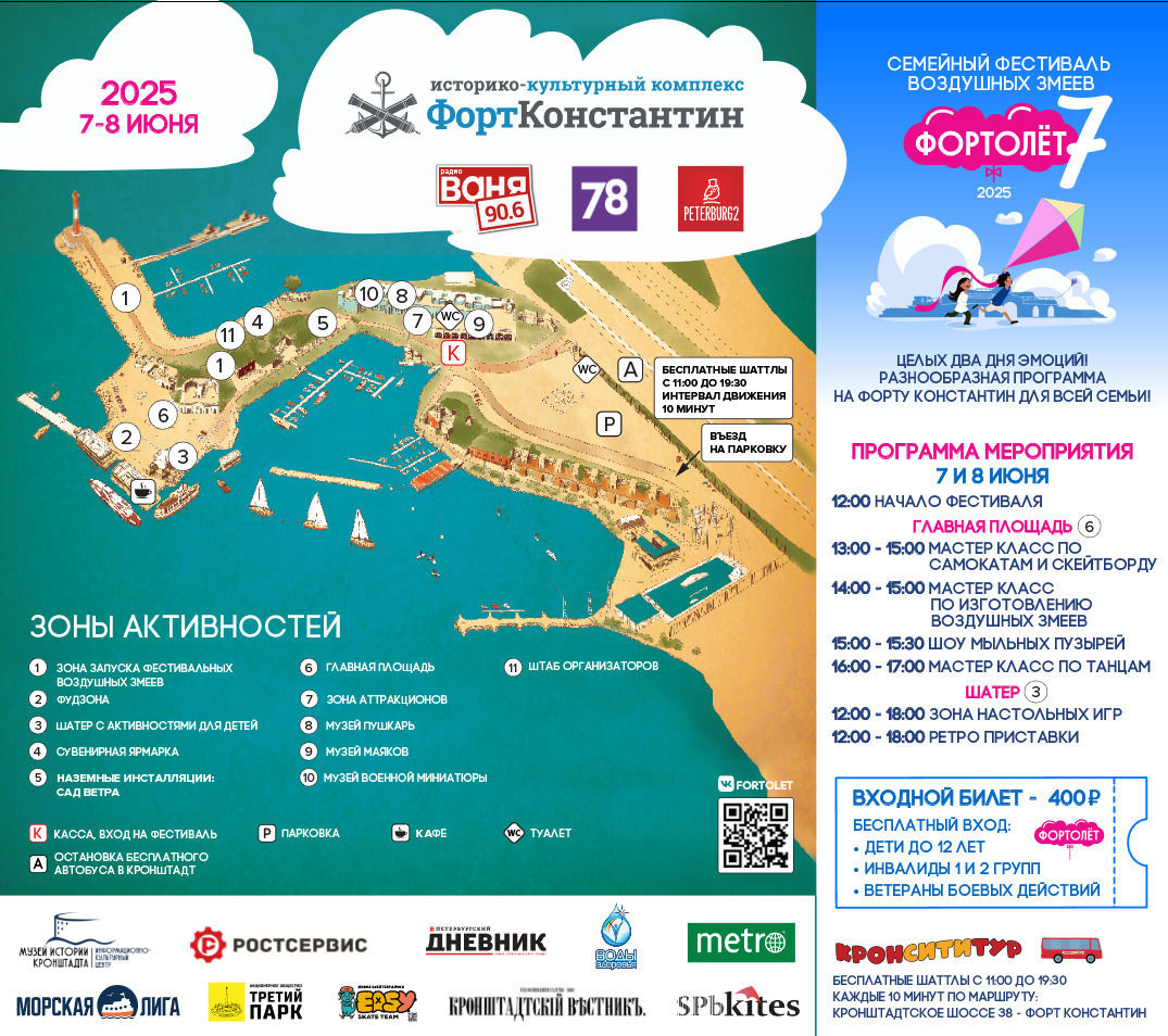 Вход – 400 рублей (парковка включена в стоимость), бесплатный вход – детям до 12 лет, участникам СВО и членам их семей. От Кронштадтского шоссе, 38, с 11:00 до 19:30 будет курсировать бесплатный автобус до форта Константин, интервал движения – каждые 15 минут.