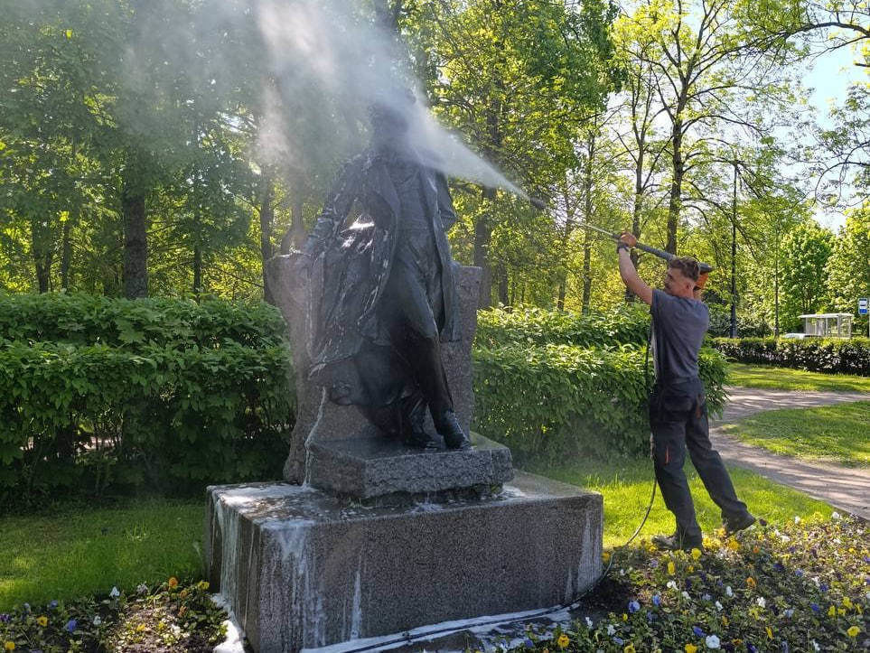 Скульптуры Александра Сергеевича помыли от сажи и пыли в Лицейском саду и у Египетских ворот. Теперь монументы солнца русской поэзии готовы к празднику.