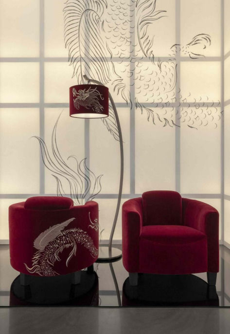 Невероятно поэтичная экспозиция Oriental Inks от Armani Casa продолжила этнические мотивы, звучавшие по всей выставке. В сотрудничестве с De Gournay знаковые предметы мебели Armani были преобразованы с помощью изысканной шелковой и бисерной вышивки, аппликаций из листового золота и рисунков в стиле классической китайской живописи и гравюры.