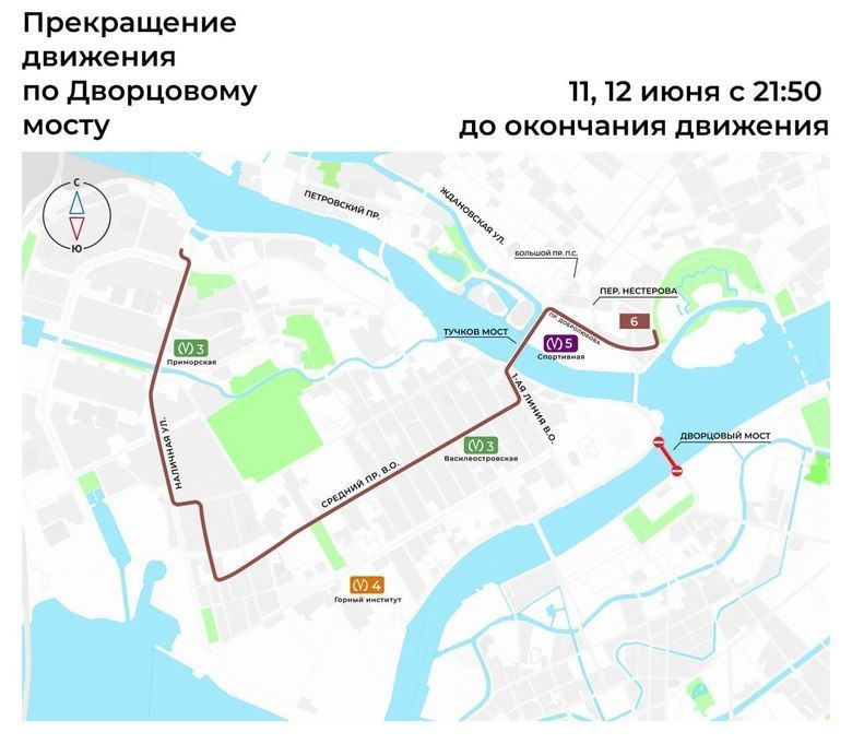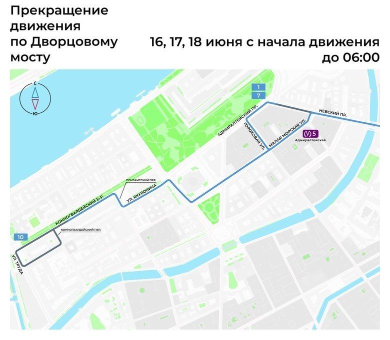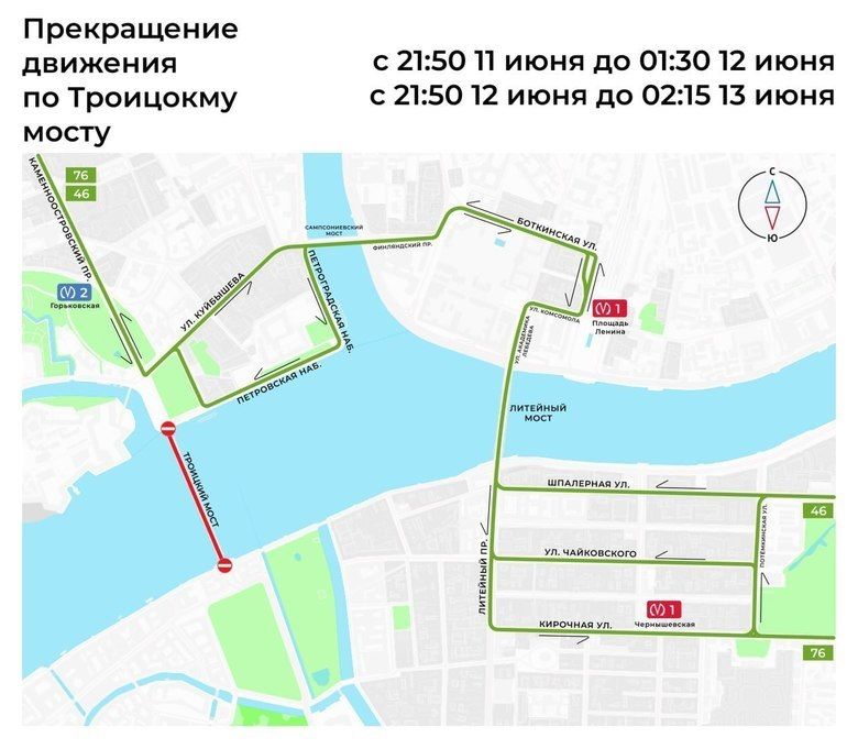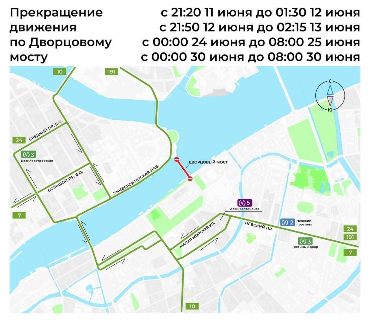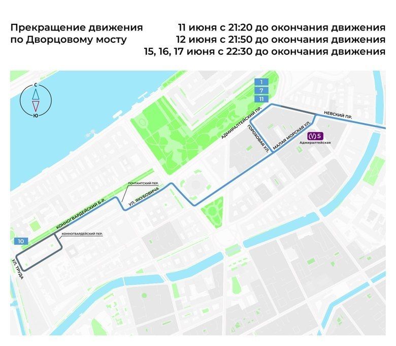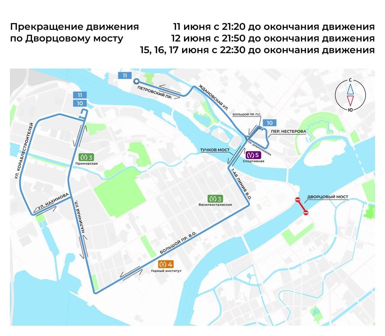 Кроме того, 16, 17 и 18 июня с начала движения до 6:00 троллейбусы №1, 7, 10 следуют по измененным трассам, троллейбус №11 направлен по трассе троллейбуса № 5. 11 и 12 июня с 21:50 до окончания движения трамвайный маршрут №6 проследует до Кронверкского проспекта.