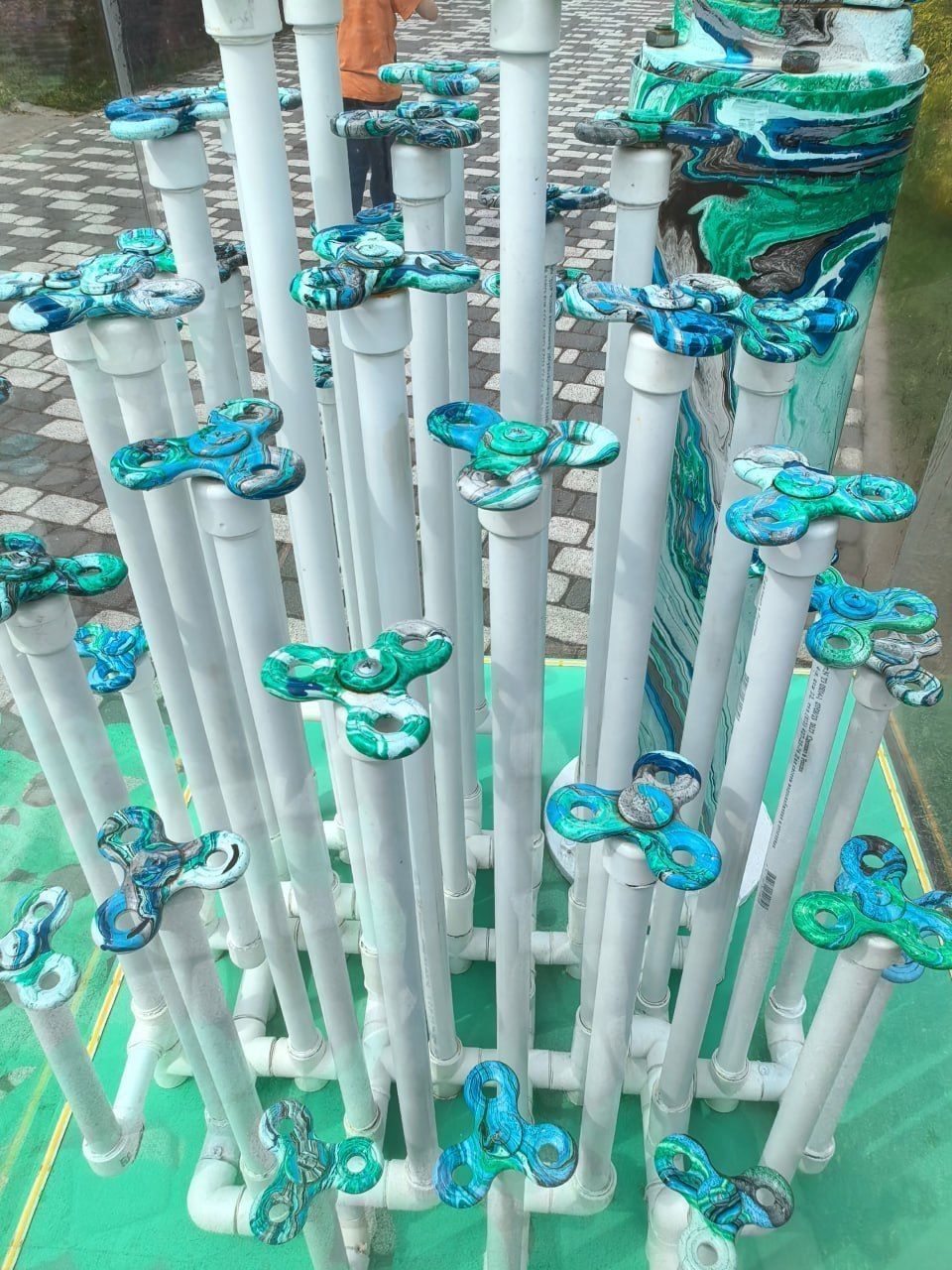 – В работе использованы промышленные материалы – колонки-гидранты, спиннеры – для создания «ботанических» форм и подтеки краски. Как этот контраст изделий работает на идею?