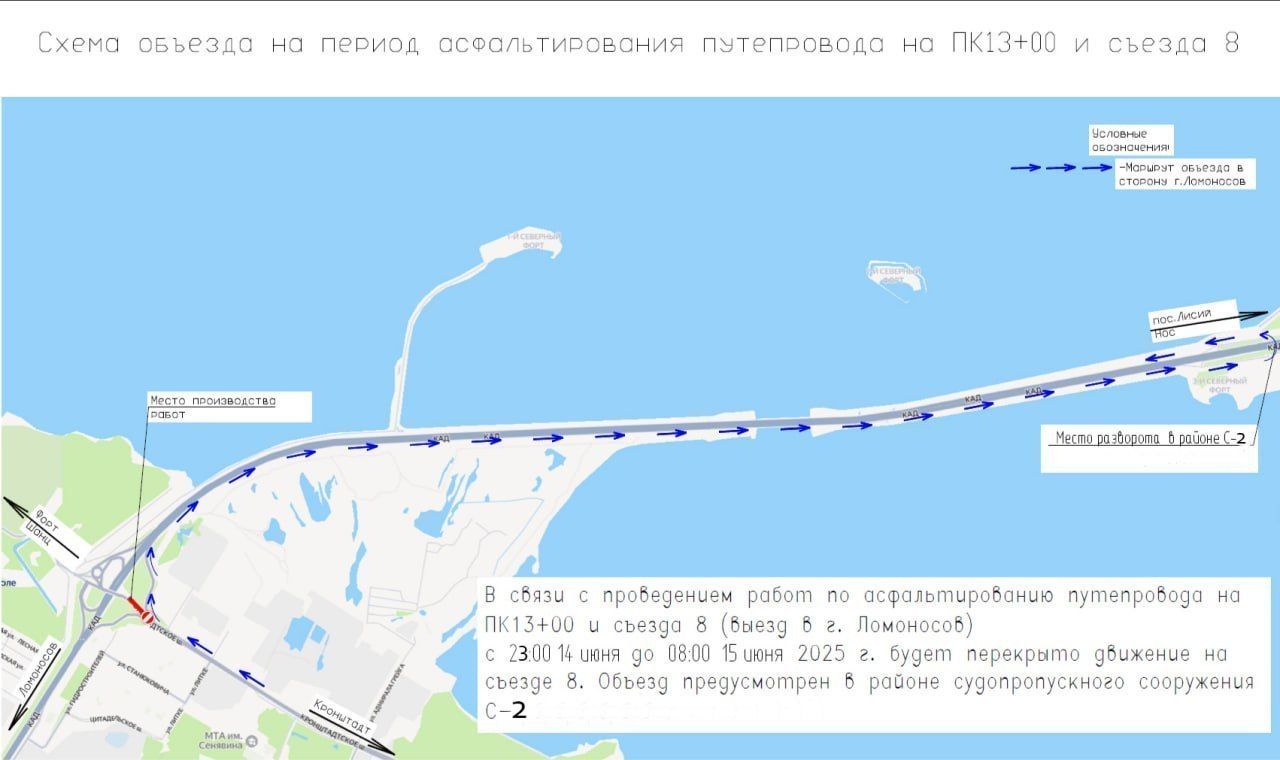 В период с 23:00 14 июня до 8:00 15 июня 2025 года на съезде №8 (выезд из Кронштадта в направлении Ломоносова) будет перекрыто движение транспорта.