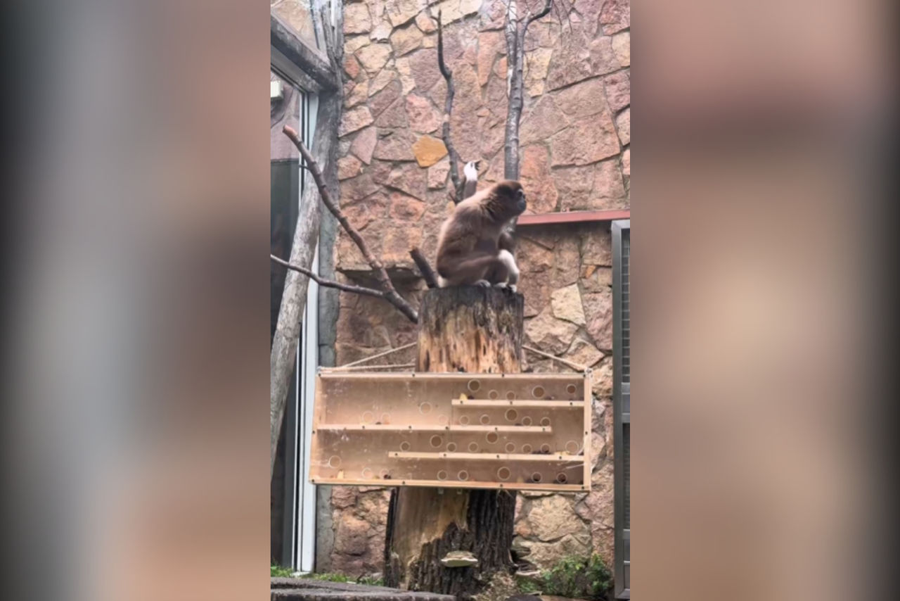 В отделе приматов Ленинградского зоопарка появилось необычное новшество. Для белоруких гиббонов сотрудники подготовили оригинальное обогащение среды – специальную головоломку с угощениями. Инженеры отдела «Развитие» совместно с кураторами приматов разработали конструкцию с отверстиями, через которые обезьяны должны были доставать лакомства.