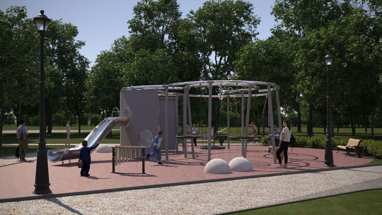 В рамках благоустройства здесь будут уложены дорожки, высажены газон, деревья и живая изгородь. Также планируется установить спортивное оборудование, детскую площадку с гнездовыми качелями, гамаком и канатными балансирами.