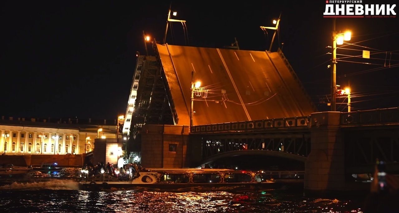 В ночь на 15 июня Дворцовый мост в Петербурге развели под музыку гимна России. Организатором звукового шоу «Поющие мосты» выступило издание «Петербургский дневник».