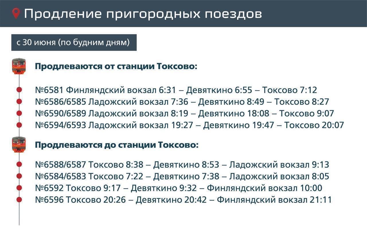 С 30 июня часть пригородных поездов по маршруту Капитолово – Девяткино – Санкт-Петербург продлеваются от и до станции Токсово, сообщили сегодня в пресс-службе Северо-Западной пригородной пассажирской компании.