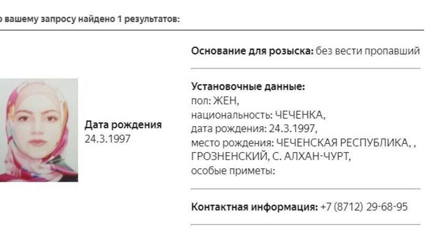 «Сулейманова Седа... 24.04.1997... основание для розыска: без вести пропавший», – сказано в документе базы розыска.