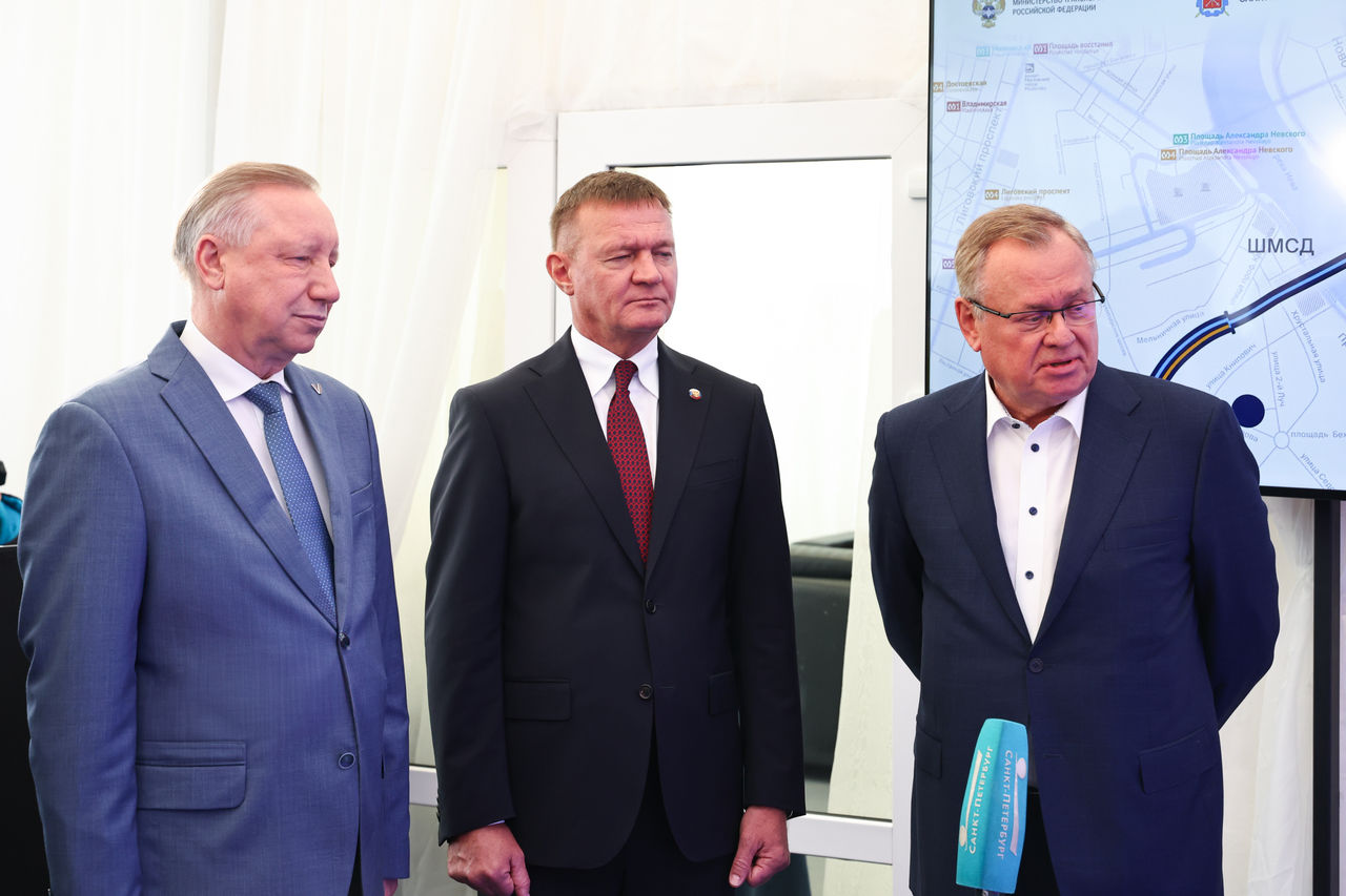 Губернатор Петербурга Александр Беглов провёл рабочую встречу с министром транспорта России Романом Старовойтом в рамках выездного мероприятия, посвященного старту строительства 2-4-го этапов Широтной магистрали скоростного движения.