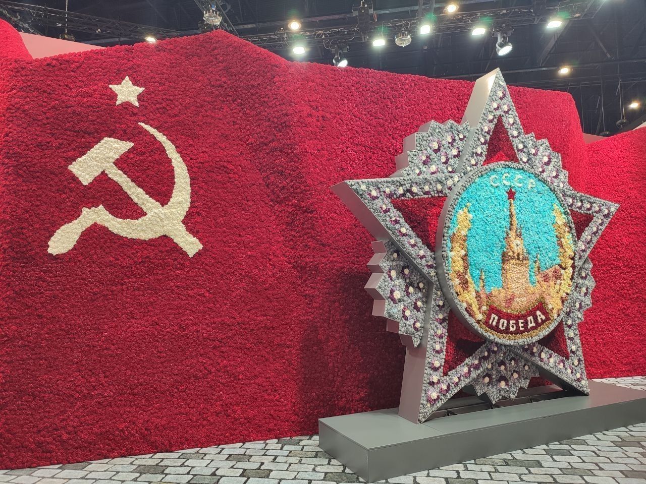 На мероприятии представлена стена из живых цветов в виде ордена «Победа», сообщает корреспондент «Петербургского дневника».