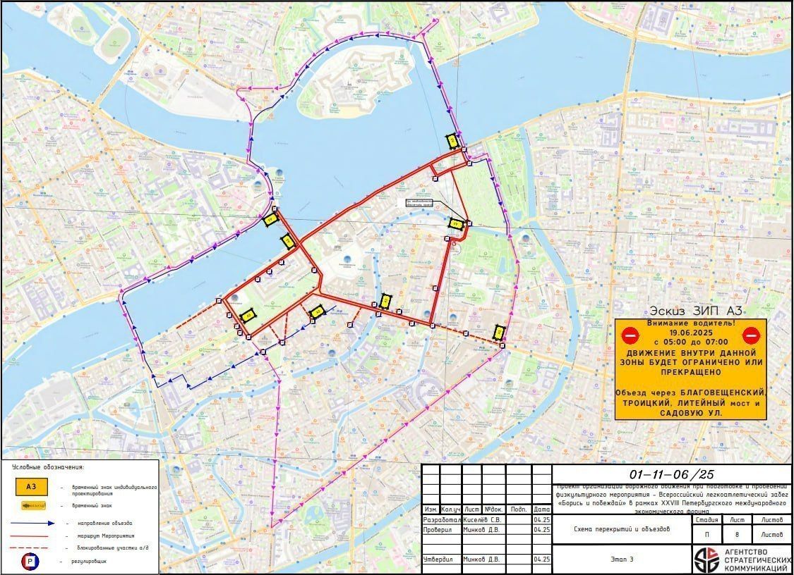 В связи с проведением спортивного события в центре Петербурга временно перекроют движение транспорта. Ограничения будут действовать с 16 по 21 июня 2025 года в соответствии со схемой, подготовленной СПб ГКУ «ДОДД».