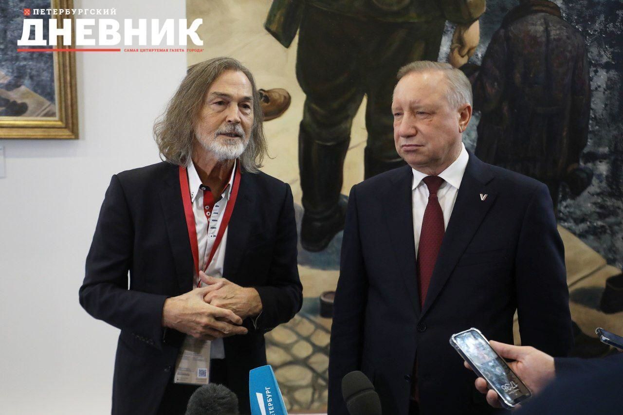 Губернатор Александр Беглов и художник Никас Сафронов на стенде Петербурга на ПМЭФ открыли выставку с картиной Никаса Сафронова. Полотно называется «Атом памяти».