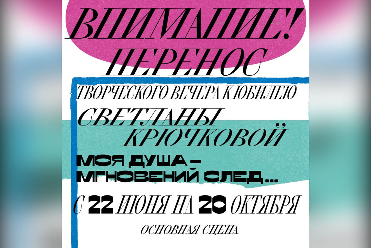 В официальном телеграм-канале БДТ имени Г. А. Товстоногова сообщили о переносе творческого вечера, посвященного юбилею выдающейся актрисы Светланы Крючковой «Моя душа – мгновений след». Мероприятие, которое было запланировано на 22 июня в 18:00 на Основной сцене, переносится на 20 октября в 19:00.