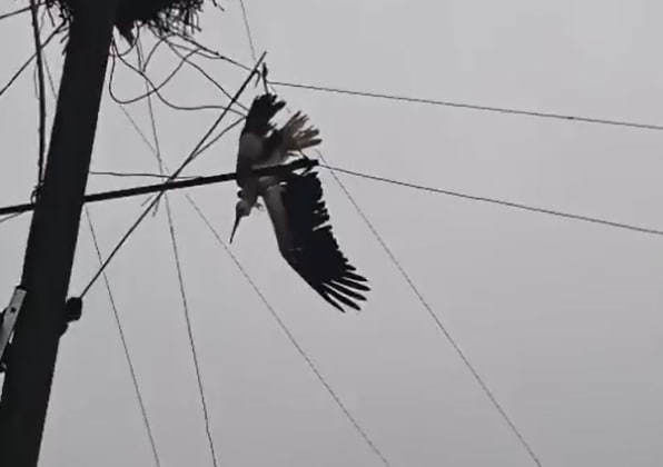 Видео: в Ленобласти аист запутался в проводах, и птенцы остались одни в опасности