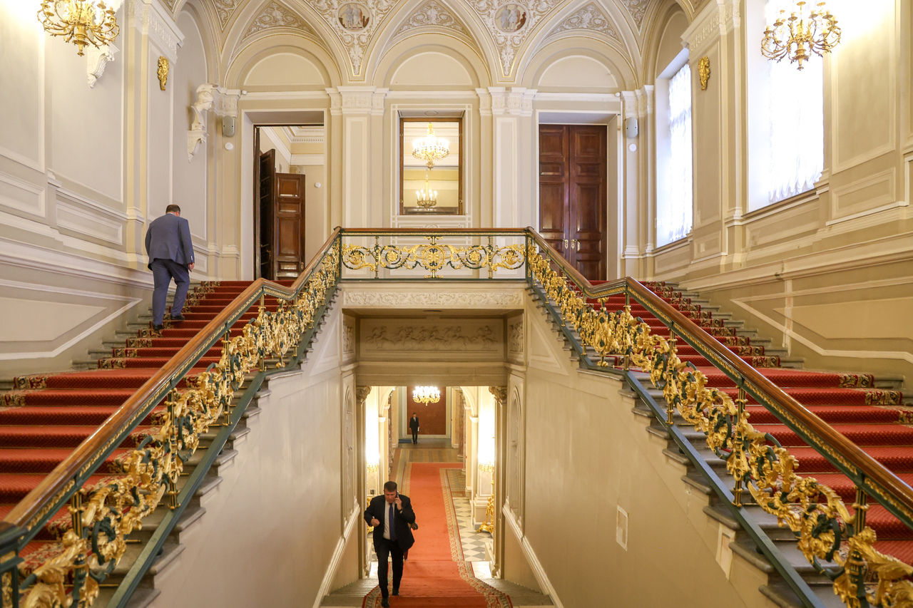 Ранее парадной лестнице Мариинского дворца вернули мраморных собак, а в Большом зале повесили копию картины Ильи Репина.