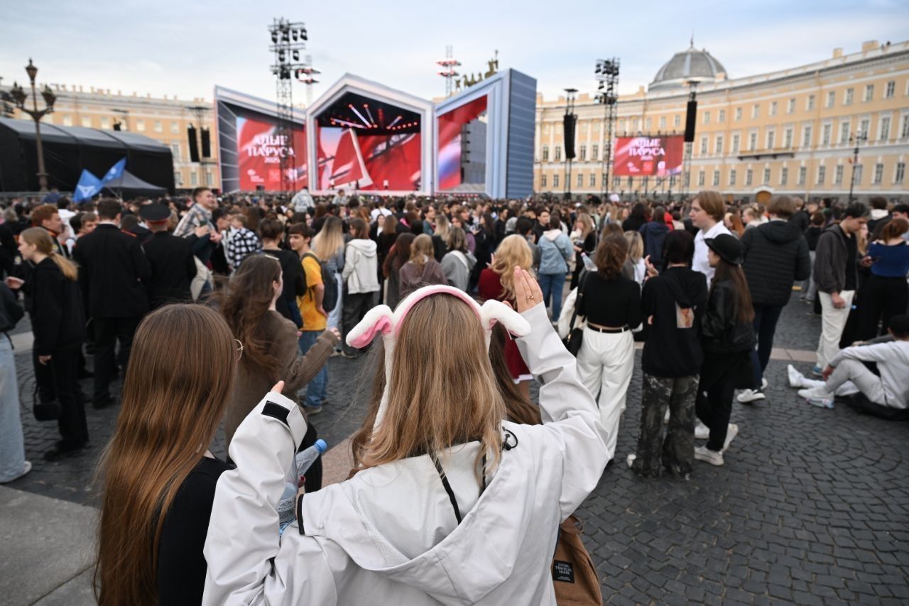 На Дворцовой площади собираются выпускники, чтобы принять участие в празднике «Алые паруса»