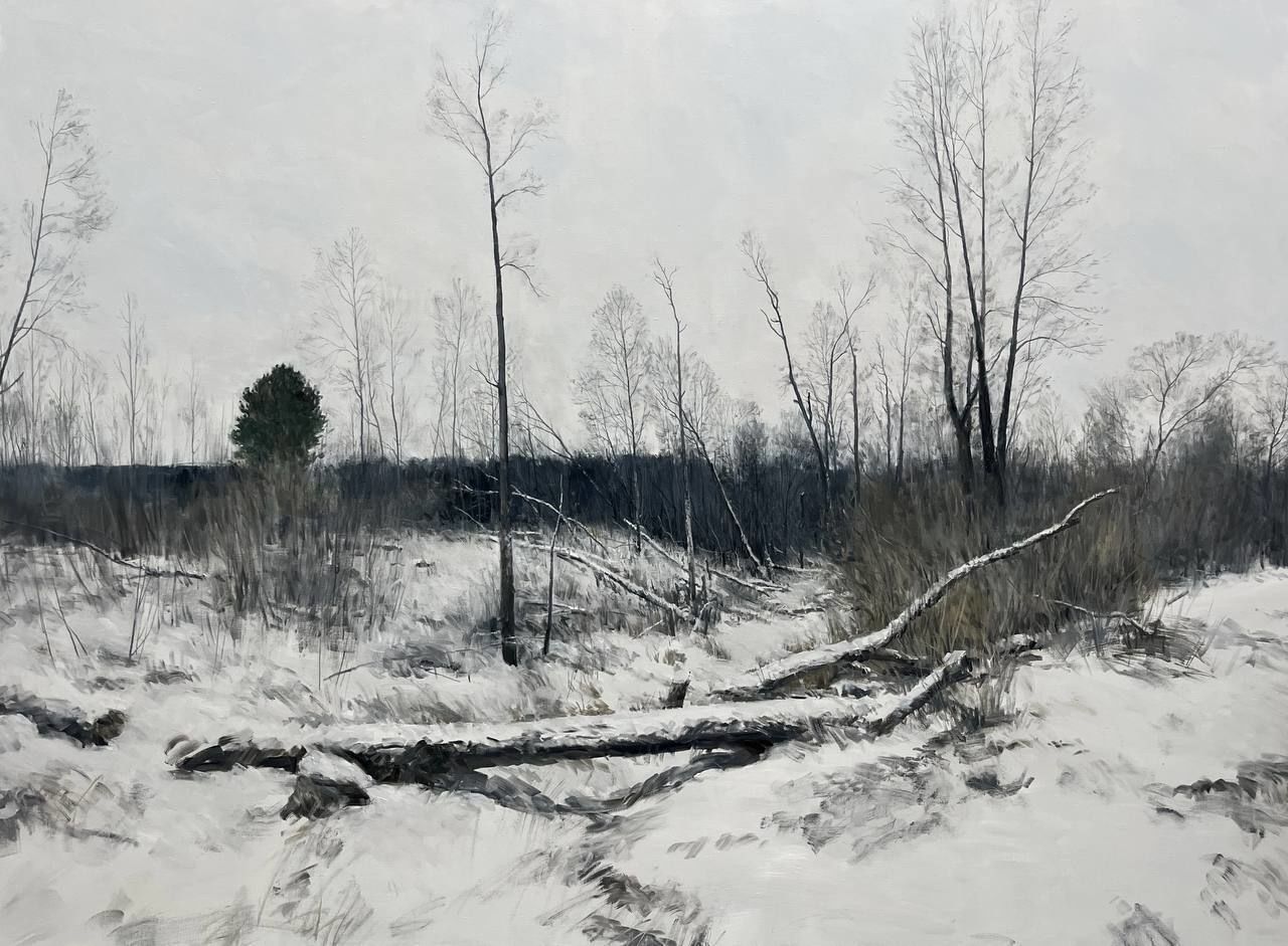 Собрание фигуративных живописных и скульптурных произведений Егора Плотникова «Дальний лес»: автор выстраивает экспозиционное пространство как имитацию художественного образа леса – натуральные стволы и ветви деревьев сливаются с живописными пейзажами и выполненными из гипса человеческими фигурами.