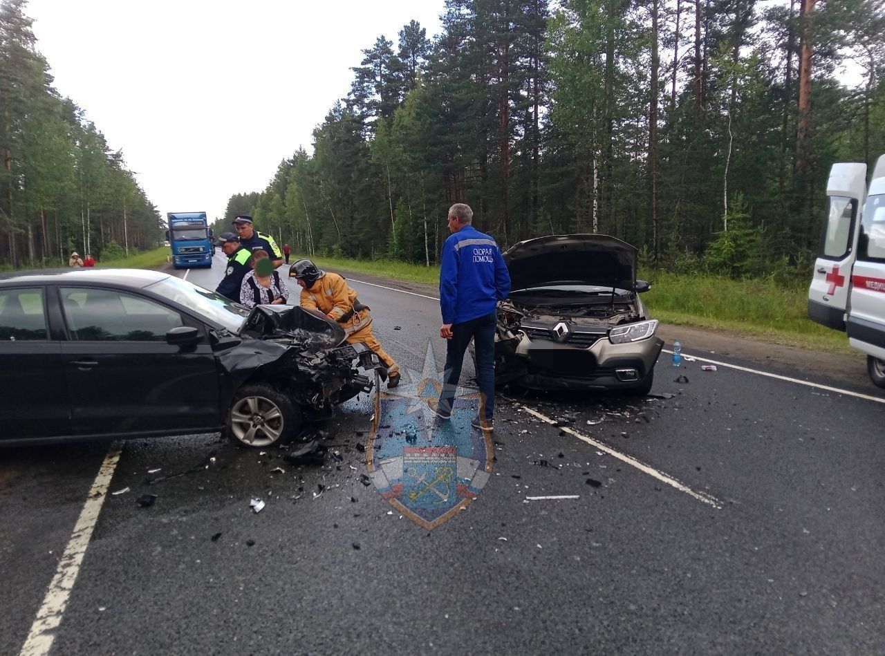 Сегодня на 261-м километре автодороги «Кола» 73-летняя женщина, управляя автомобилем «Фольксваген Поло», не справилась с управлением и выехала на полосу встречного движения, где столкнулась с автомобилем «Рено» под управлением 58-летнего водителя.