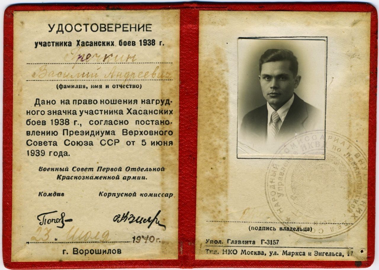 Младший политрук 3-го танкового батальона 2-й механизированной бригады 1-й отдельной Краснознаменной армии Гречкин принял участие в боях на Дальнем Востоке против японских захватчиков в районе озера Хасан. За храбрость и мужество Василий Гречкин в 1938 году награжден медалью «За боевые заслуги». До сих пор сохранилось групповое фото награжденных в тот день. Также Василий Гречкин получил нагрудный знак «Участнику Хасанских боев». Во время службы в армии он экстерном сдал экзамены на младшего командира, а перед увольнением прошел сборы по подготовке младших политруков запаса.