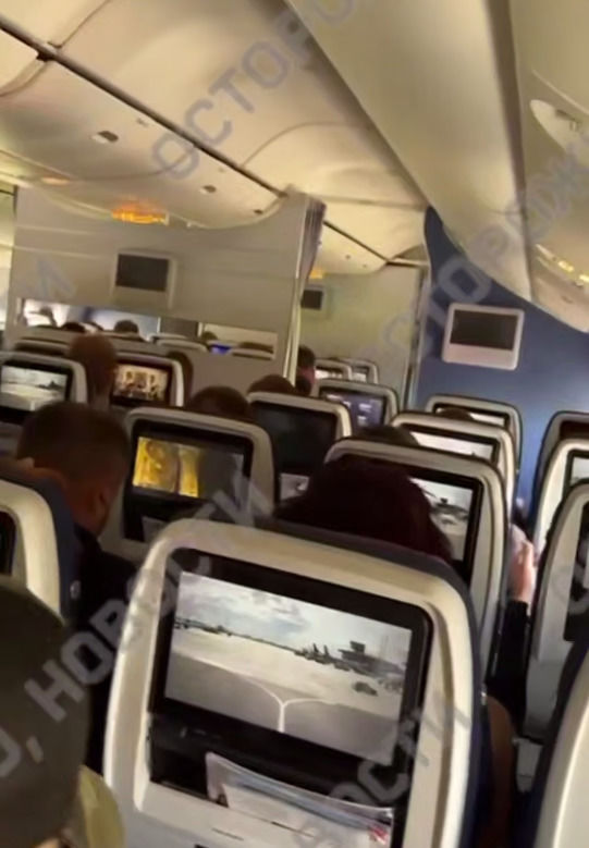 Telegram-канал «Осторожно, новости» опубликовал видео очевидцев из салона самолета. Сейчас он уже приземлился, но пассажиры все еще находятся внутри.