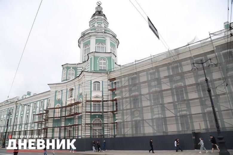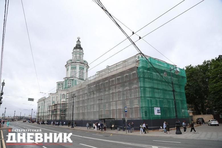 Здание Музея антропологии и этнографии имени Петра Великого Российской академии наук облачают в строительные леса перед масштабными ремонтно-реставрационными работами, которые планировали начать в третьем квартале.