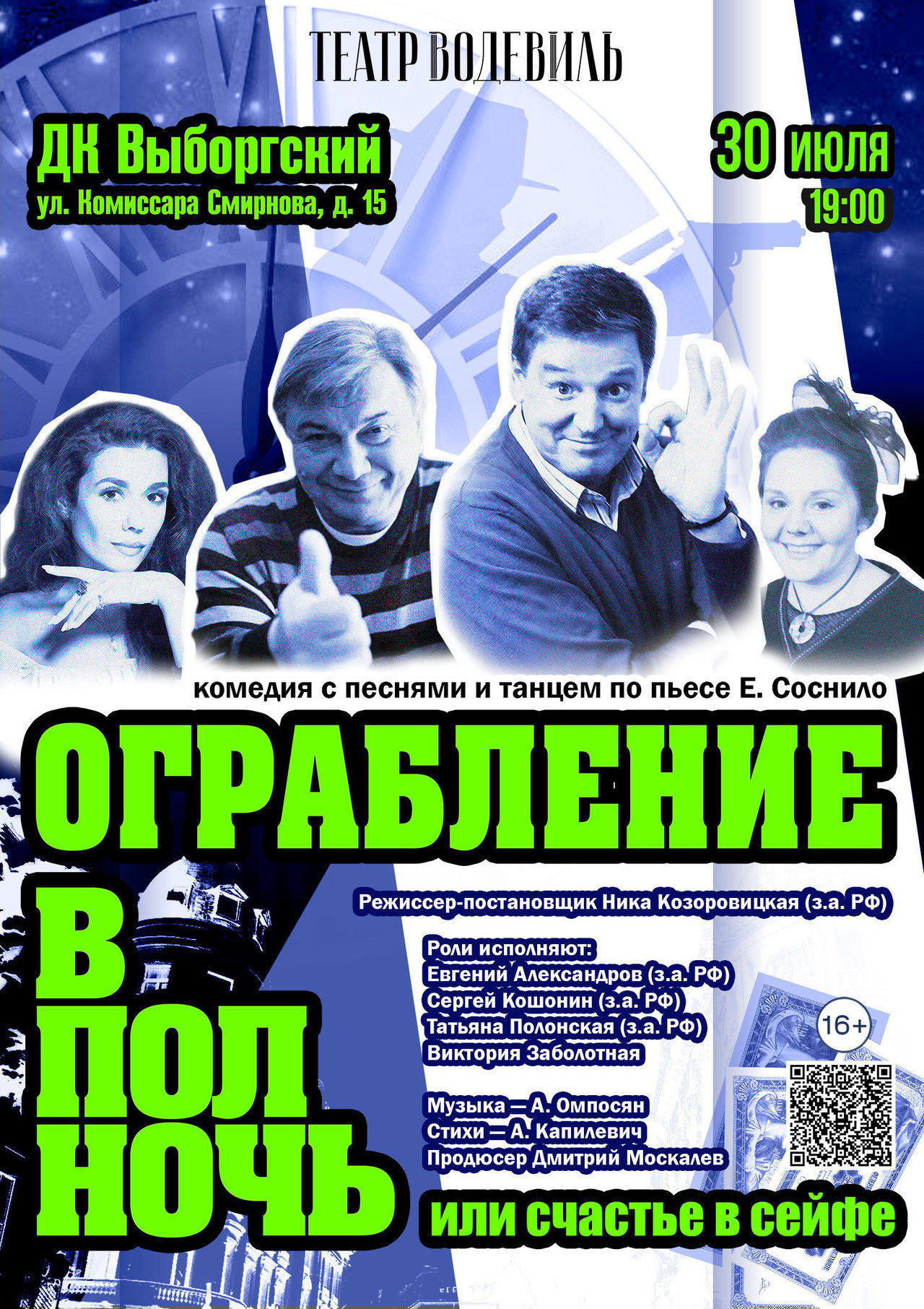Санкт-Петербургский театр «Водевиль» в среду, 30 июля, представит спектакль «Ограбление в полночь, или Счастье в сейфе» на сцене ДК «Выборгский». Об этом сообщает пресс-служба театра.