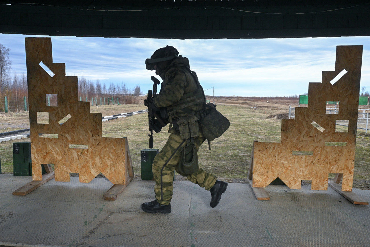 Военнослужащие подразделений спецназа Северо-Западного округа в бронежилетах и с оружием преодолели трассу с испытаниями.