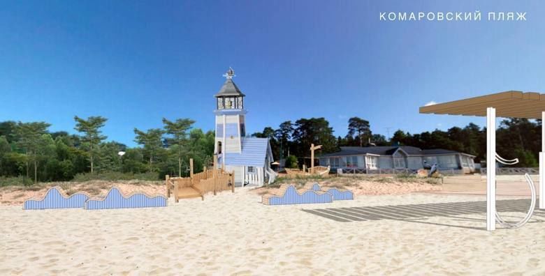 Планируется, что в этом году Комаровский пляж в створе Морской улицы получит обновление в водной тематике. Там установят четыре раздевалки, спасательную вышку, скамьи для маломобильных граждан, лежаки, навесы, гамаки. Также там появятся два игровых комплекса и велопарковка.