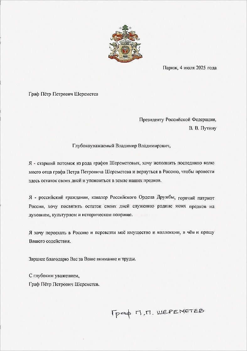 В письме автор подчеркивает, что как старший потомок знаменитого рода графов Шереметевых он намерен исполнить последнюю волю своего отца – провести остаток жизни в России и быть похороненным на родине предков.