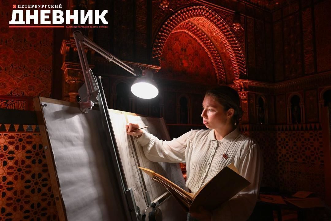 По-настоящему восточная роскошь. Одно время в Мавританской гостиной располагалась чертежная мастерская. Профессиональные инструменты поместили туда вновь. Под мягким светом ламп девушки будто создавали заново исторический ансамбль Петербурга. А для вдохновения напевали советские мотивы.