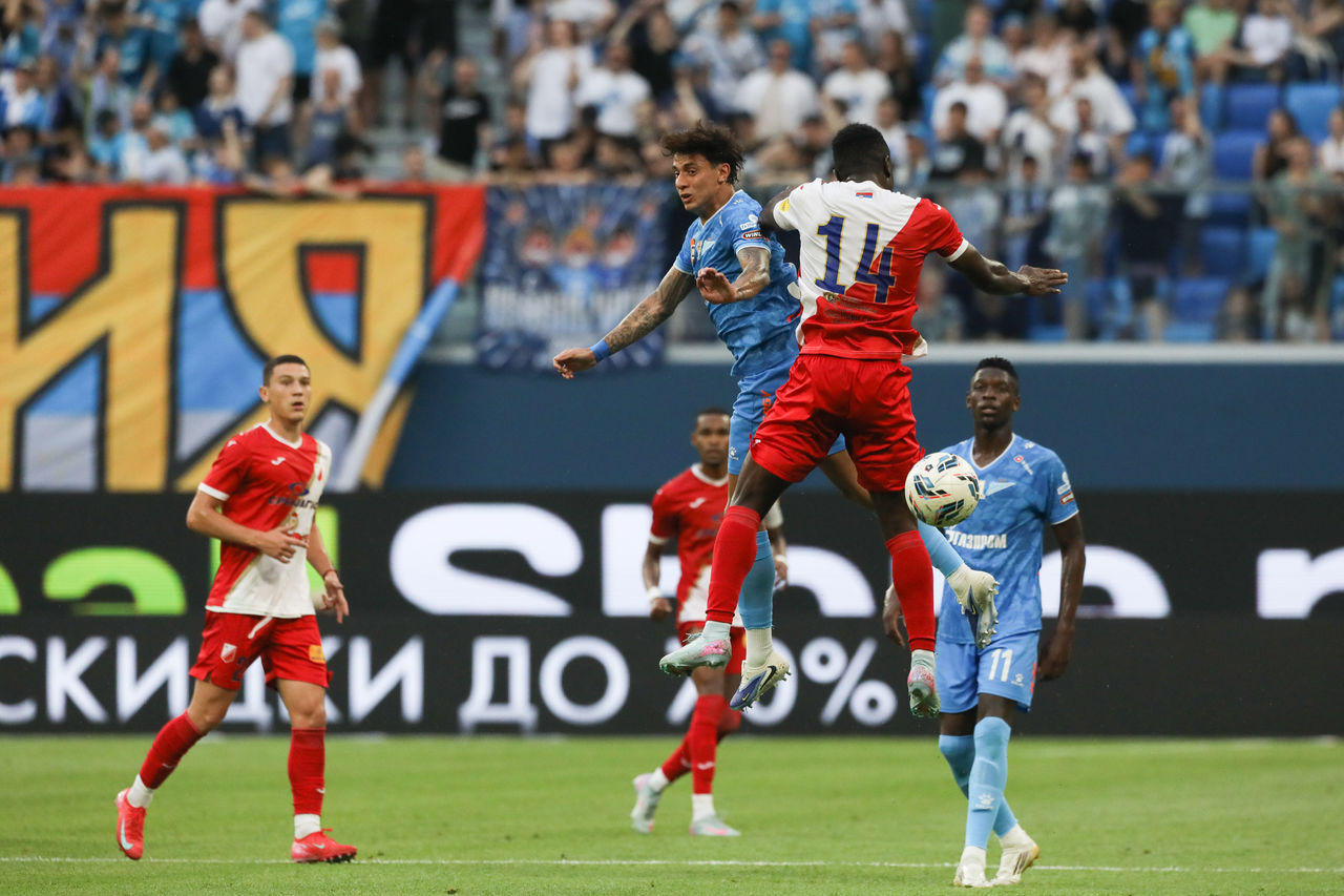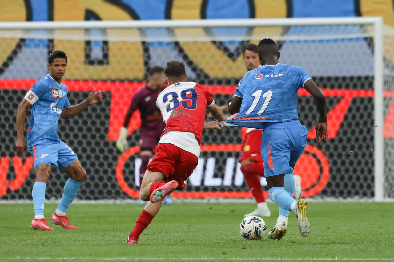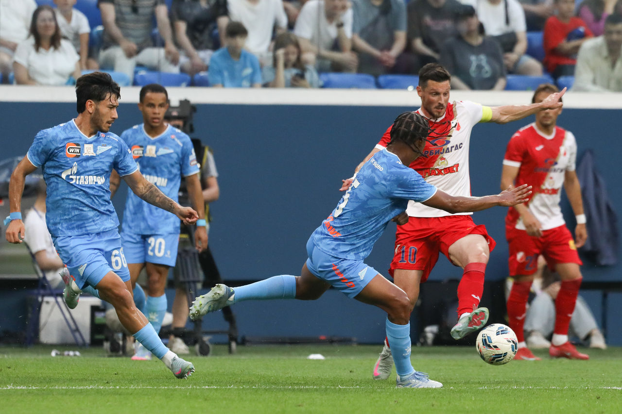Игра вице-чемпиона России прошлого сезона с шестой командой Сербии получилась весёлой и щедрой на голы. Зенитовцы быстро забили три мяча. На пятой минуте Максим Глушенков с углового закрутил мяч в ворота по недосягаемой для голкипера траектории. Через две минуты Луис Энрике удвоил счёт, затем отличился Дуглас Сантос на 21-й минуте. Оба бразильца после розыгрыша стандартных положений оказывались расторопнее соперников в их штрафной. Ведя 3:0, петербургская команда расслабилась, позволив Негошу Петровичу отквитать один мяч, но быстро восстановила разрыв. И четвёртый мяч был забит после «стандарта»: подача Глушенкова и удар головой Матео Кассьерры.
