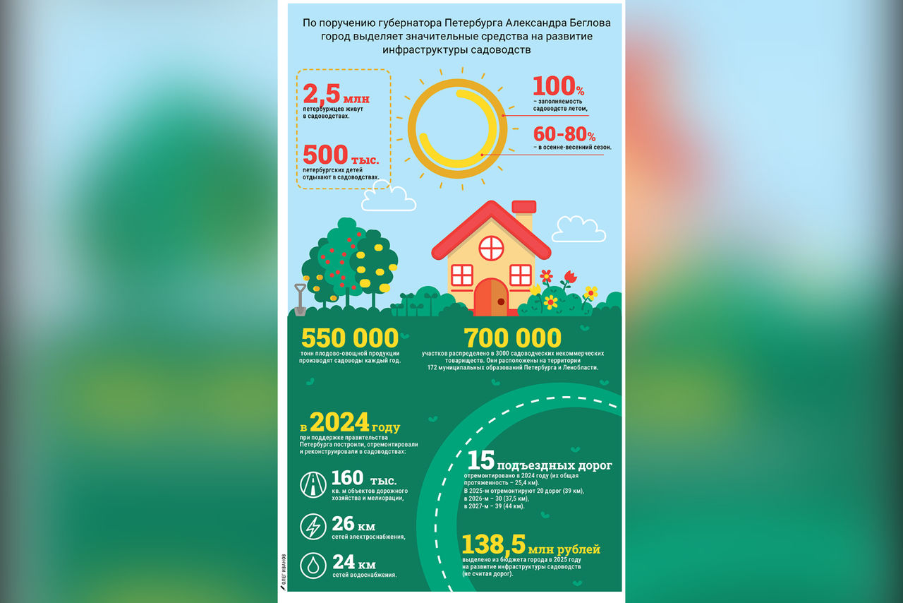 По поручению губернатора Санкт-Петербурга Александра Беглова город выделяет значительные средства на развитие инфраструктуры садоводств. В них живут 2,5 миллиона петербуржцев. Отдыхают в садоводствах летом 500 тысяч петербургских детей.