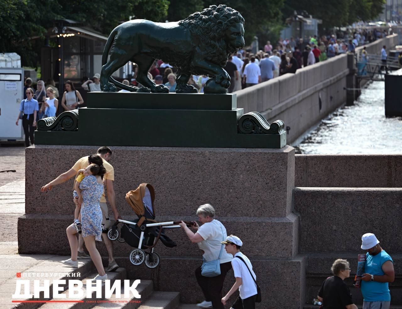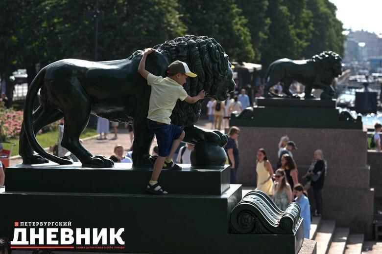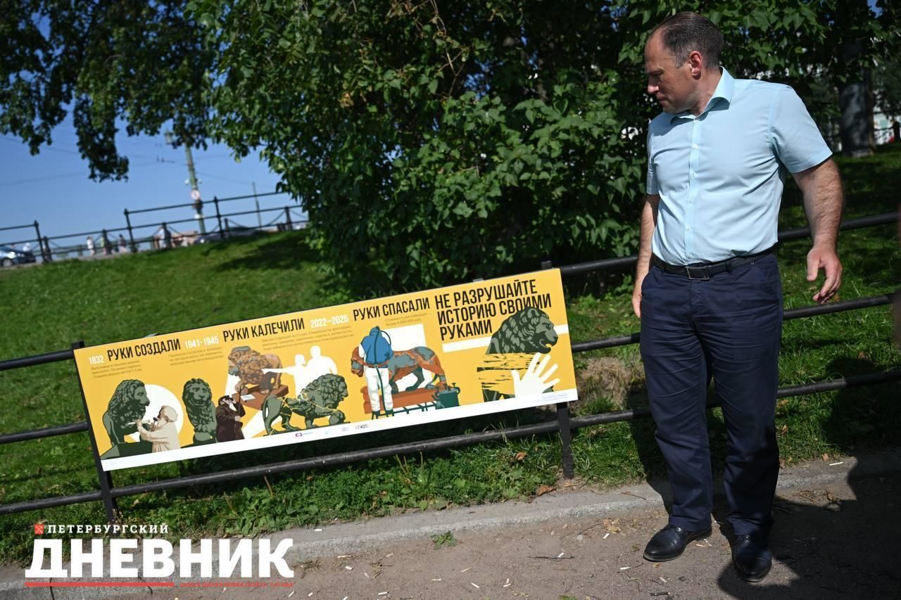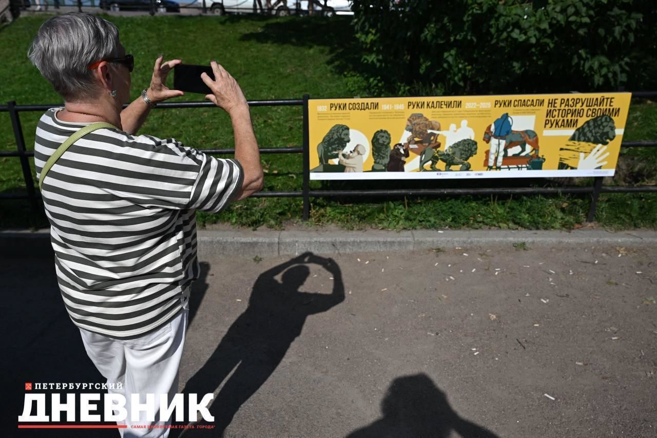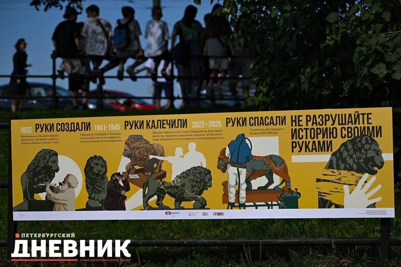 У львов на Дворцовой пристани появился плакат с призывом беречь скульптуры