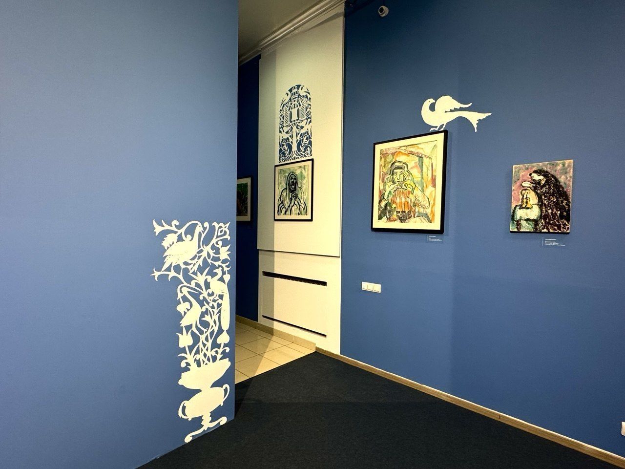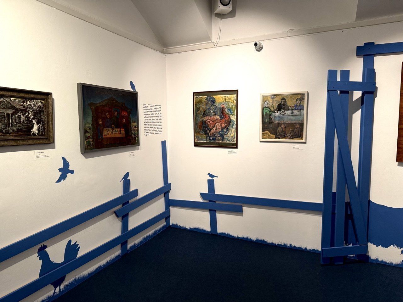 Экспозиция разделена на концептуальные зоны. Первый этаж – «местечко». На стенах – улицы, портреты. На лестнице представлен «семейный альбом». Второй этаж – «синагога»: картины с библейскими сюжетами. А балкон, названный «Райский сад», на самом деле отсылает к еврейскому кладбищу.