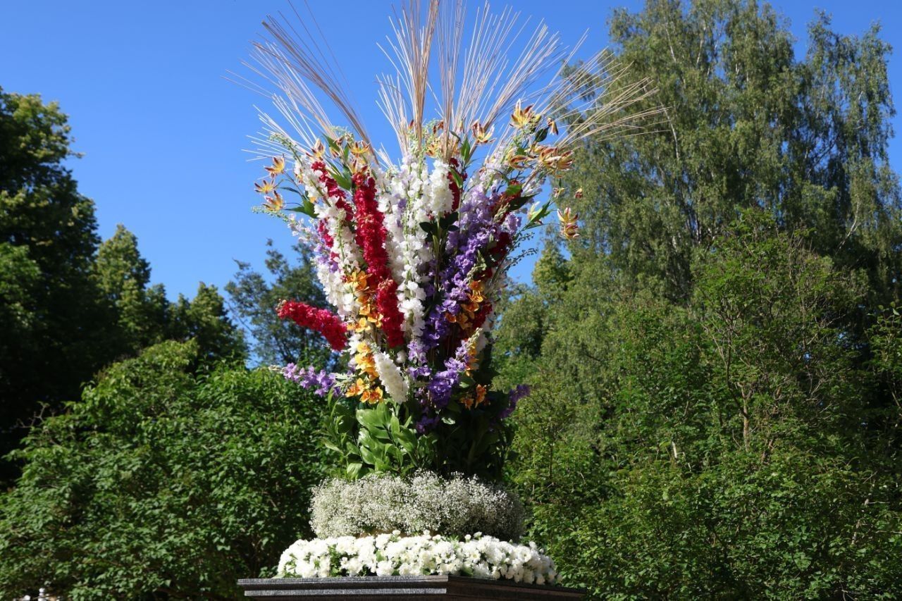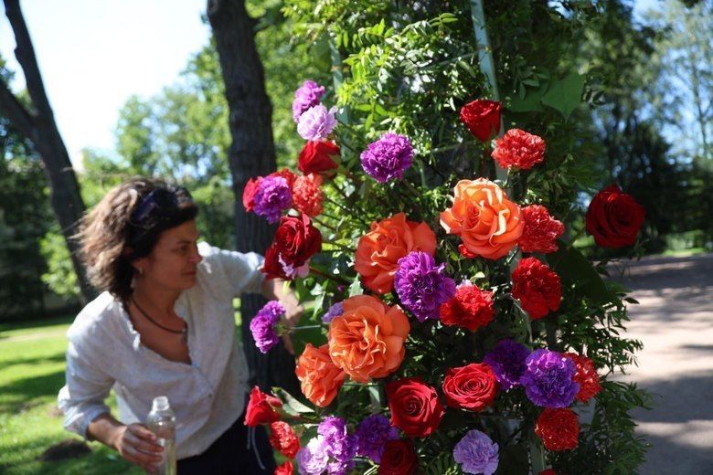 Для этой цели флористы используют более 5 тысяч срезанных цветов – это розы, хризантемы, пионы, гвоздики, гортензии, гладиолусы разных оттенков и сортов. Большинство выращено в России, часть поступила из-за рубежа. Кроме того, используются более 6 тысяч ветвей и срезанной зелени – эвкалипта, цинерарии, пальмы, рускуса.