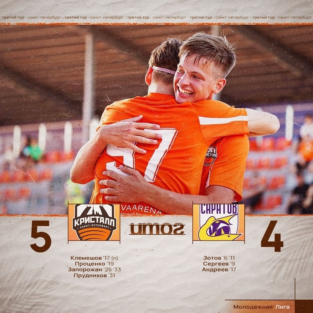 Петербургский «Кристалл» одержал волевую победу над «Саратовом» в матче третьего тура Молодежной лиги по пляжному футболу. Команда вырвала победу со счетом 5:4, отыгравшись по ходу встречи с 0:3 и 1:4.