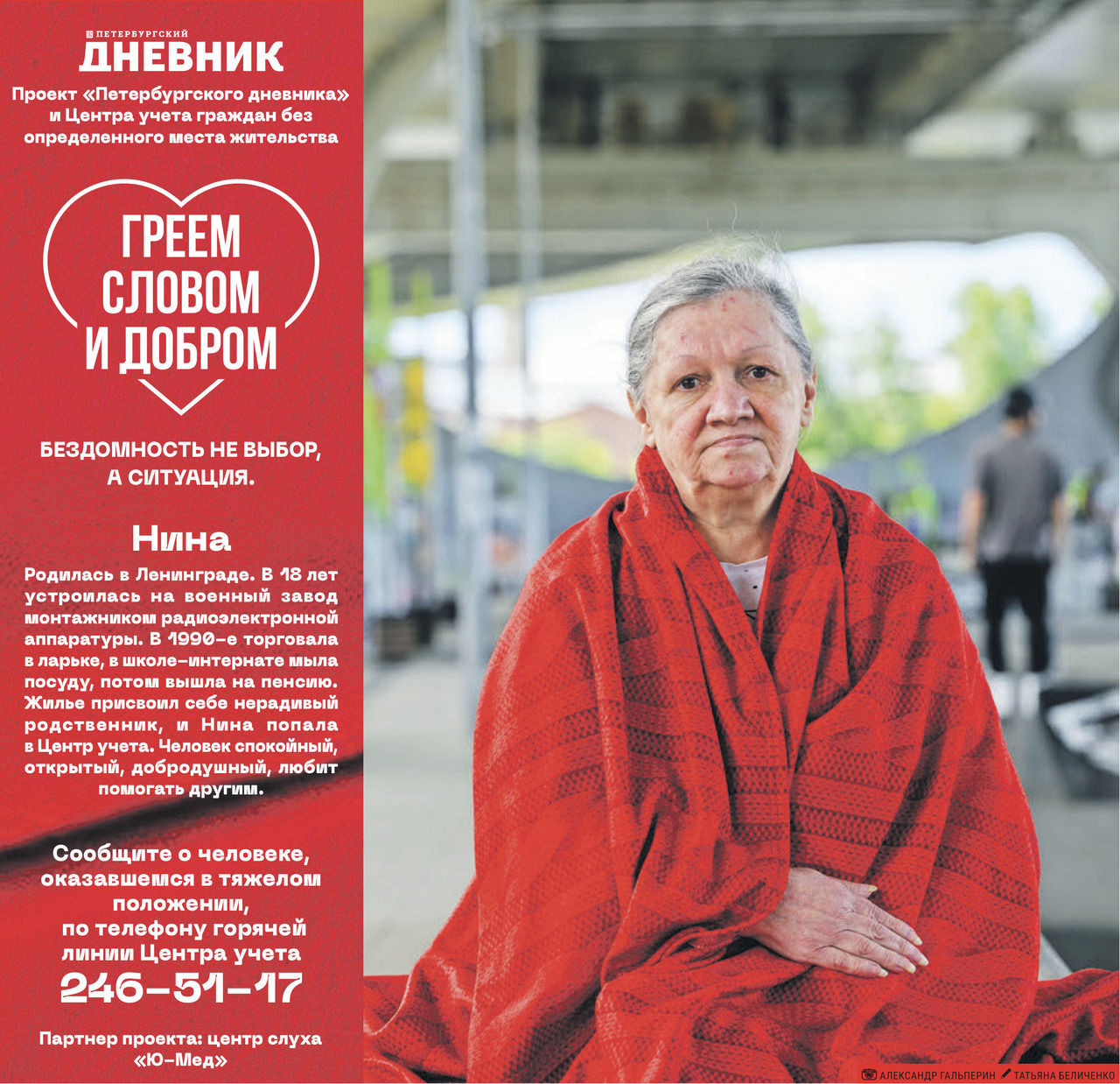 «Петербургский дневник» совместно с Центром учёта граждан без определённого места жительства продолжает свою акцию «Греем словом и добром». В этот раз петербуржцам рассказали о жительнице Северной столицы Нине.