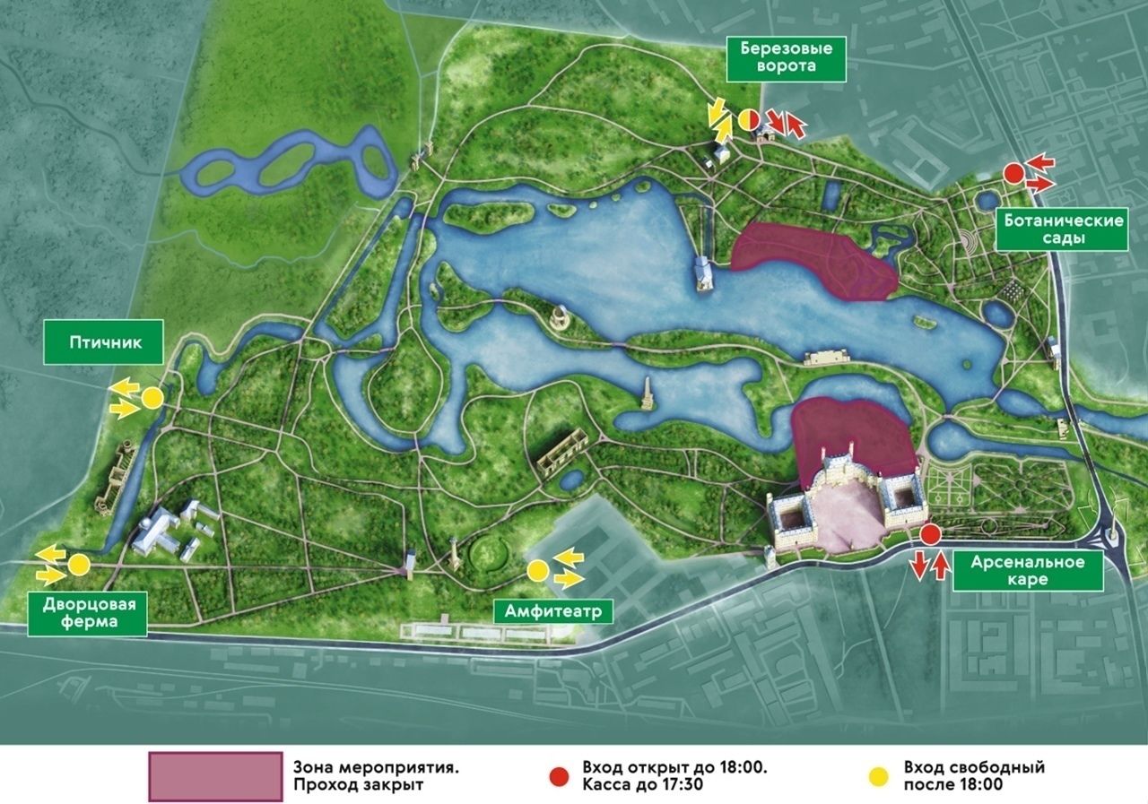 С 18:00 центральная часть парка будет закрыта для подготовки к «Ночи музыки». Также после 18:00 будут закрыты вход у дворца (Арсенальное каре) и вход у Типографии (Ботанические сады).