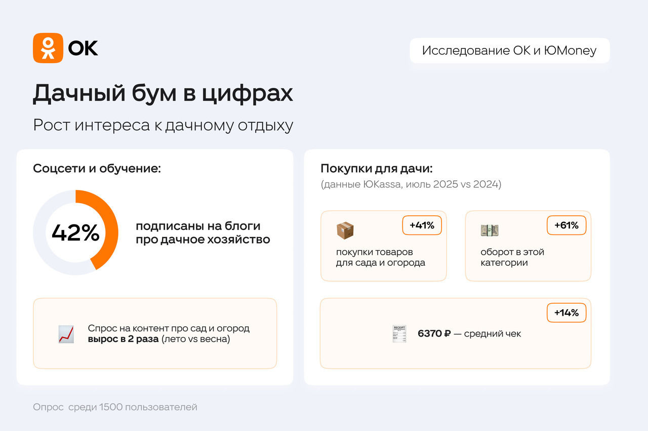Рост интереса к садоводству и дачному хозяйству подтверждают и данные ЮKassa. Так, по данным сервиса, с 1 по 15 июля 2025 года на 41 процент выросло число покупок товаров для сада и огорода относительно тех же дат в прошлом году. Кроме того, оборот в этой категории стал выше на 61 процент, а средний чек вырос на 14 процентов и составил 6370 рублей.