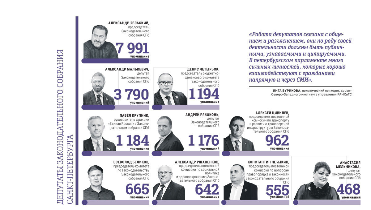«Первое место в Петербурге по цитируемости среди депутатов всегда занимает председатель Законодательного собрания и традиционно с большим отрывом», – оценила результаты совместного исследования «Медиалогии» и «Петербургского дневника» политический психолог, доцент РАНХиГС Инга Бурикова.