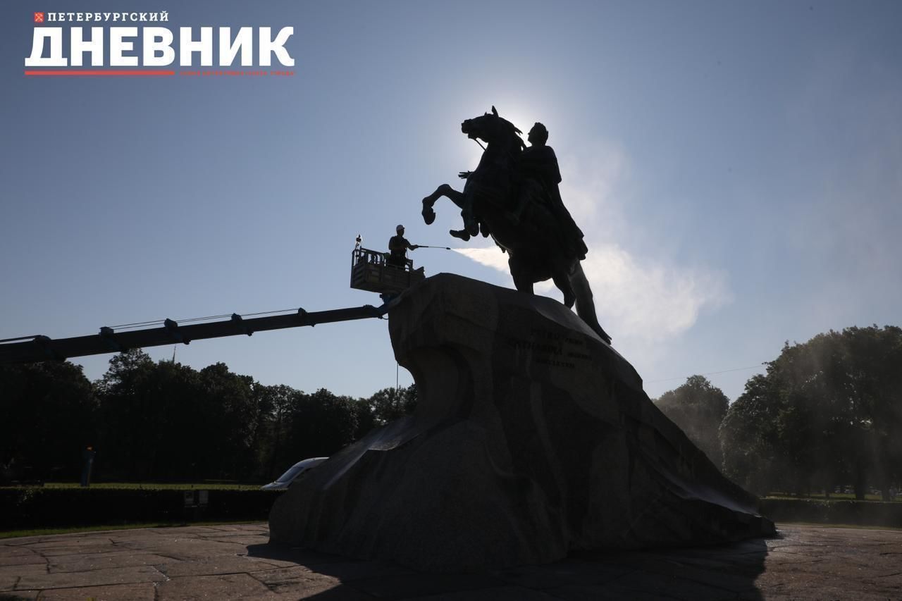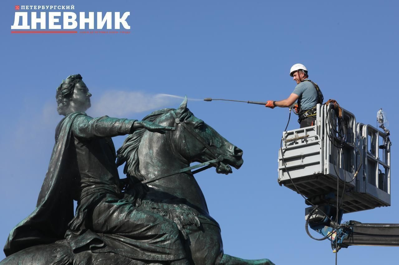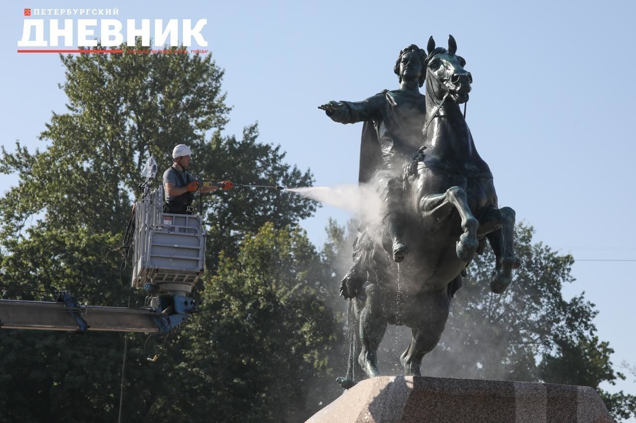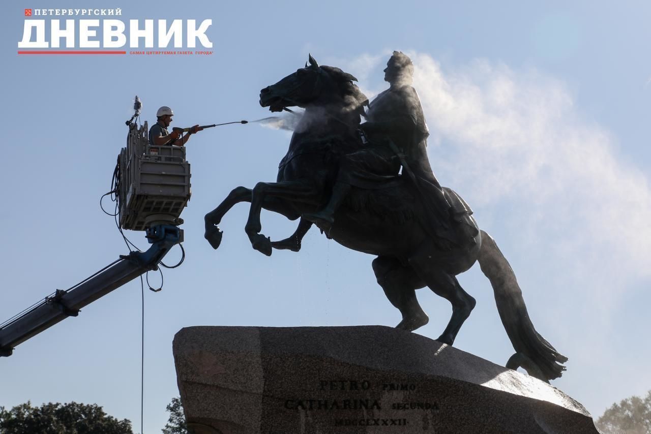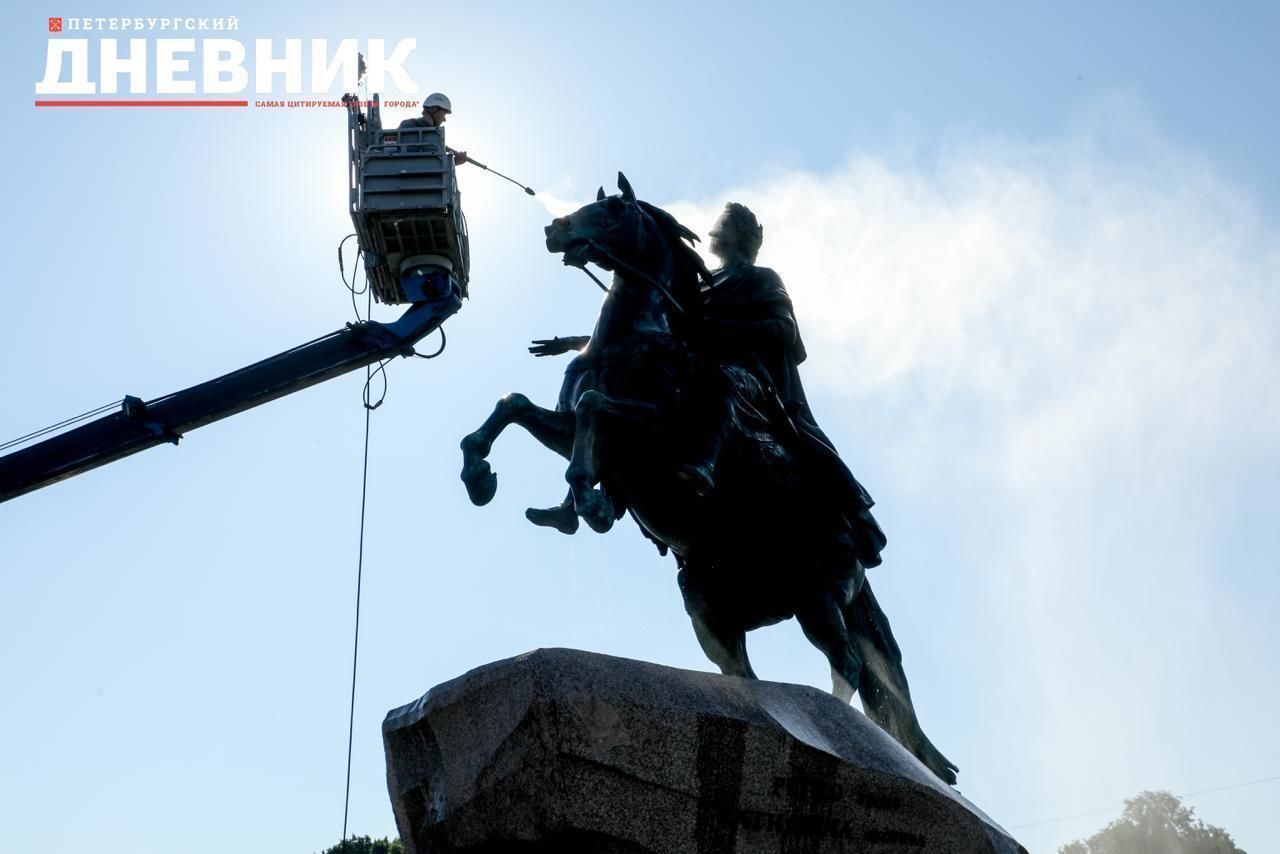 В Петербурге прошла помывка памятника Петру Первому на Сенатской площади. Процесс запечатлел фотограф «Петербургского дневника».