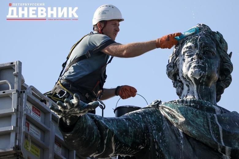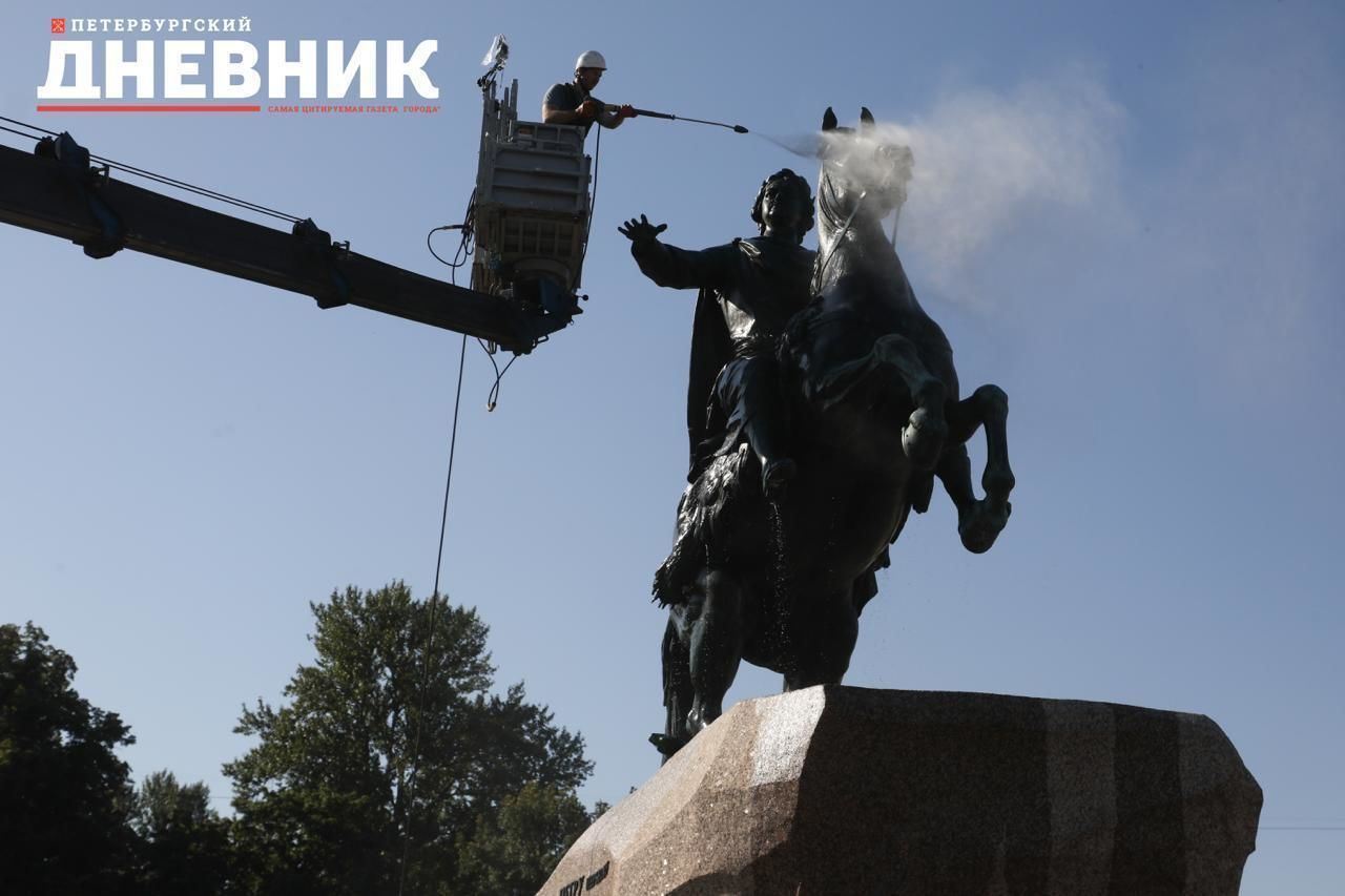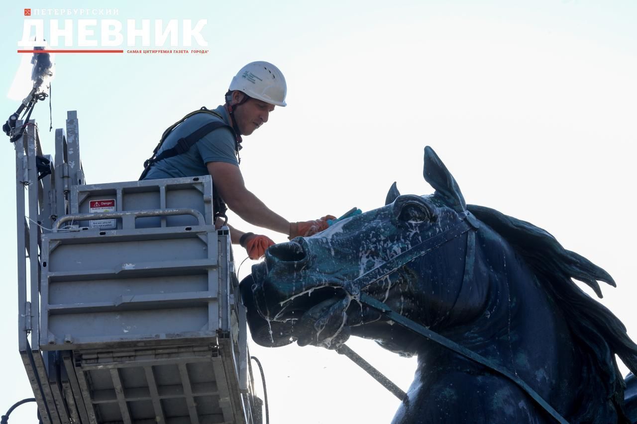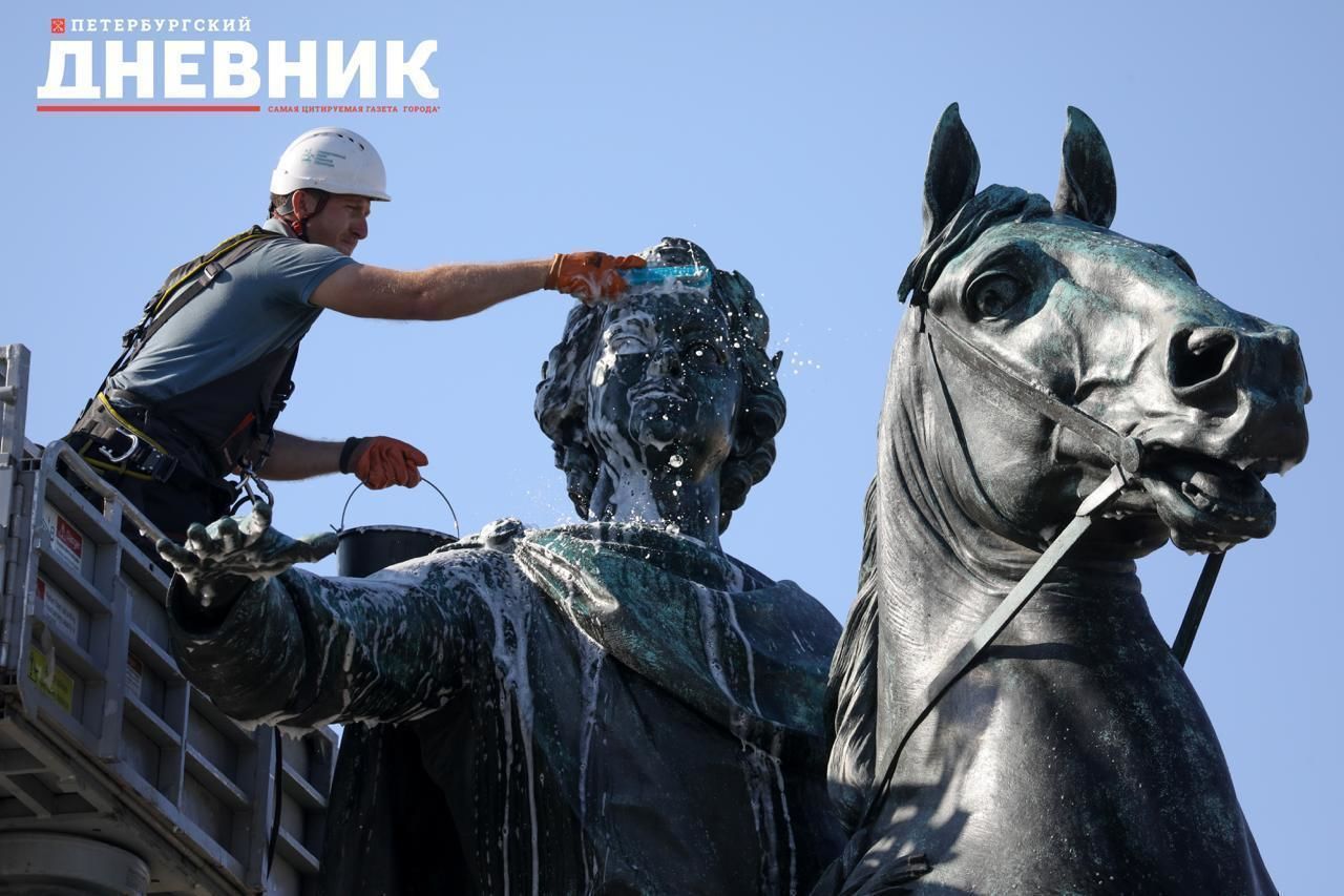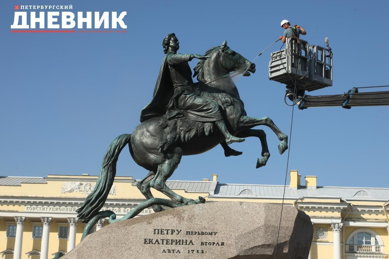В Петербурге прошла помывка памятника Петру Первому на Сенатской площади. Процесс запечатлел фотограф «Петербургского дневника».