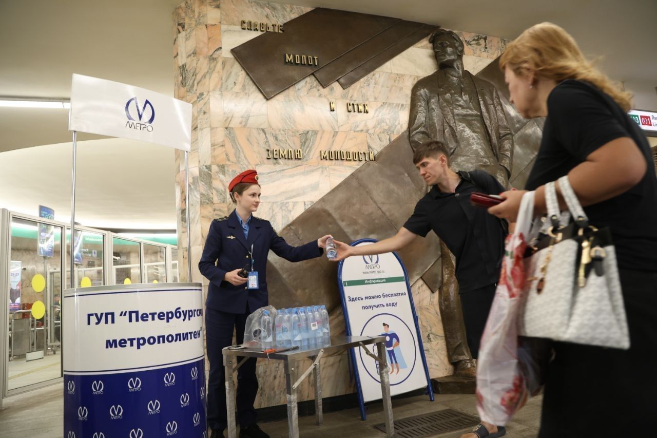 В метро Петербурга начали раздавать питьевую воду из-за жары. Список станций, где доступна вода: «Проспект Ветеранов» (вестибюль 2), «Площадь Ленина» (вестибюль 1), «Маяковская», «Проспект Просвещения», «Петроградская», «Горьковская», «Достоевская», «Ладожская», «Адмиралтейская», «Сенная площадь». Список станций может быть расширен в зависимости от температурных показателей. Специалисты метрополитена постоянно отслеживают ситуацию.