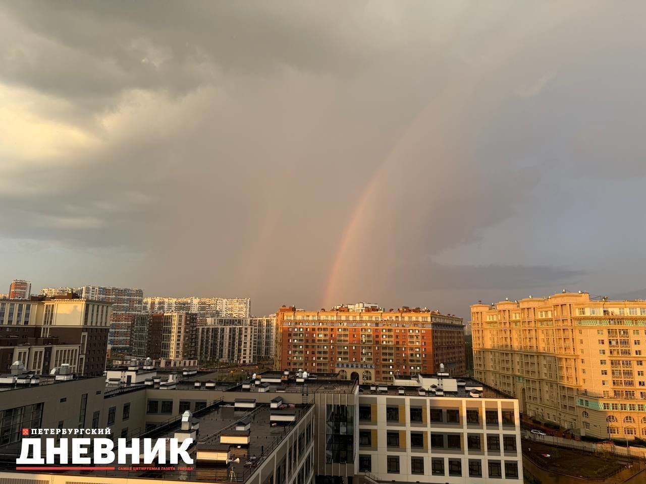 После сильного ливня, который обрушился на Петербург сегодня вечером, в небе появилась радуга. Фотокорреспондент «Петербургского дневника» поделился красивым снимком.